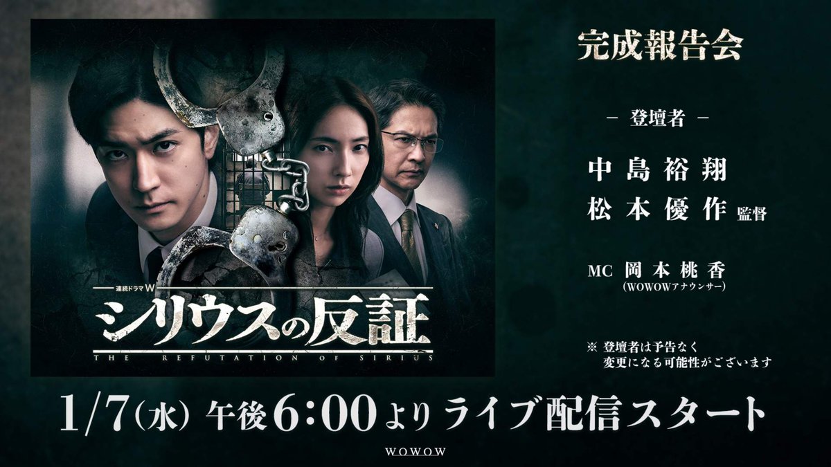 @drama_wowow【大阪開催】WOWOW×J:COM 『連続ドラマW #シリウスの反証』 舞台挨拶&第1話特別上映会に抽選で40名様をご招待🎟️ 📅日付/会場 2026/1/16(金) 大阪市内某所 👤登壇者(予定) #中島裕翔、#松本優作 監督 ご応募詳細はこちら⬇️ wowow.co.jp/plusw/present.… 📺2026/1/10(土)午後10:00放送・配信スタート pic.x.com/nKCktmRsM5